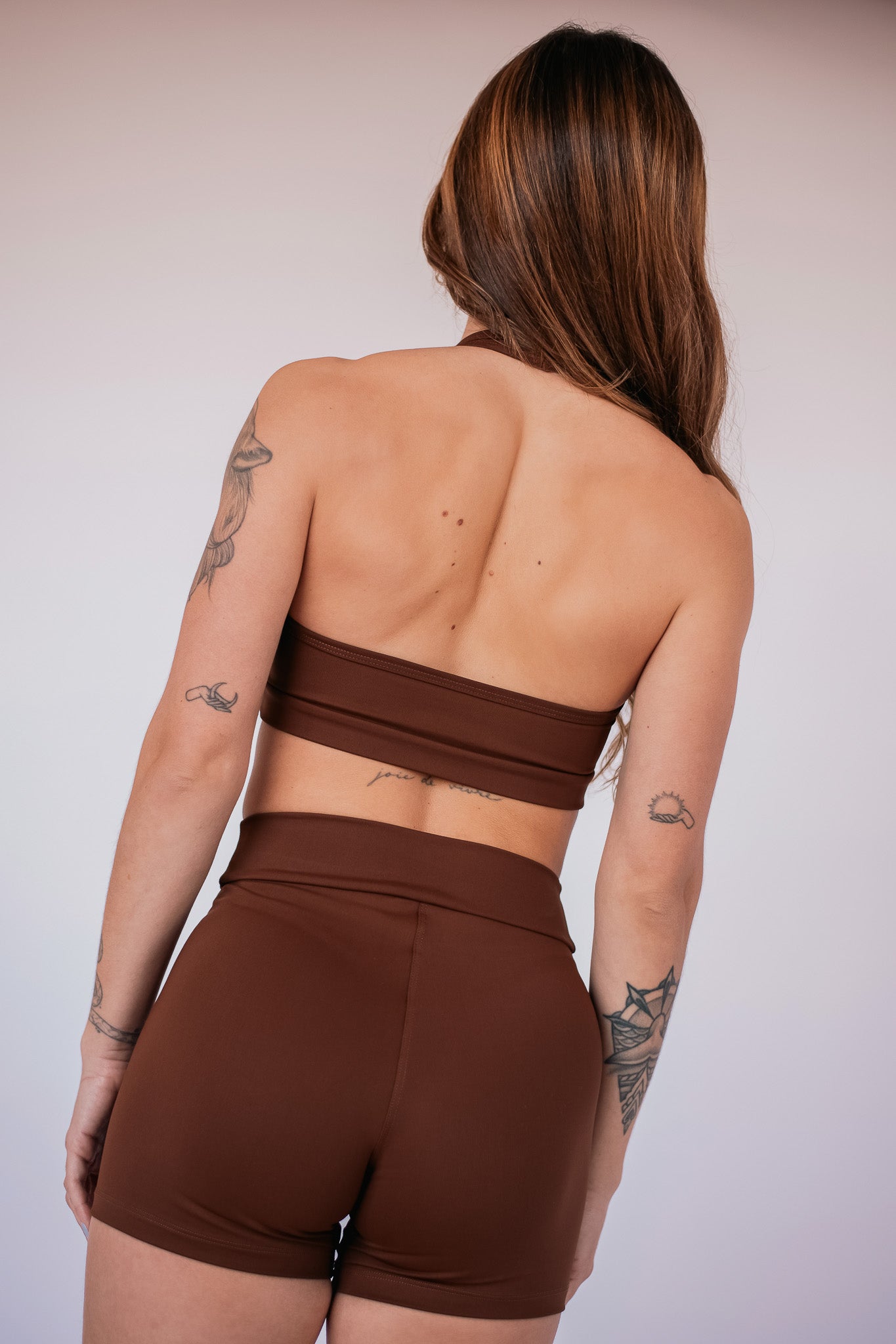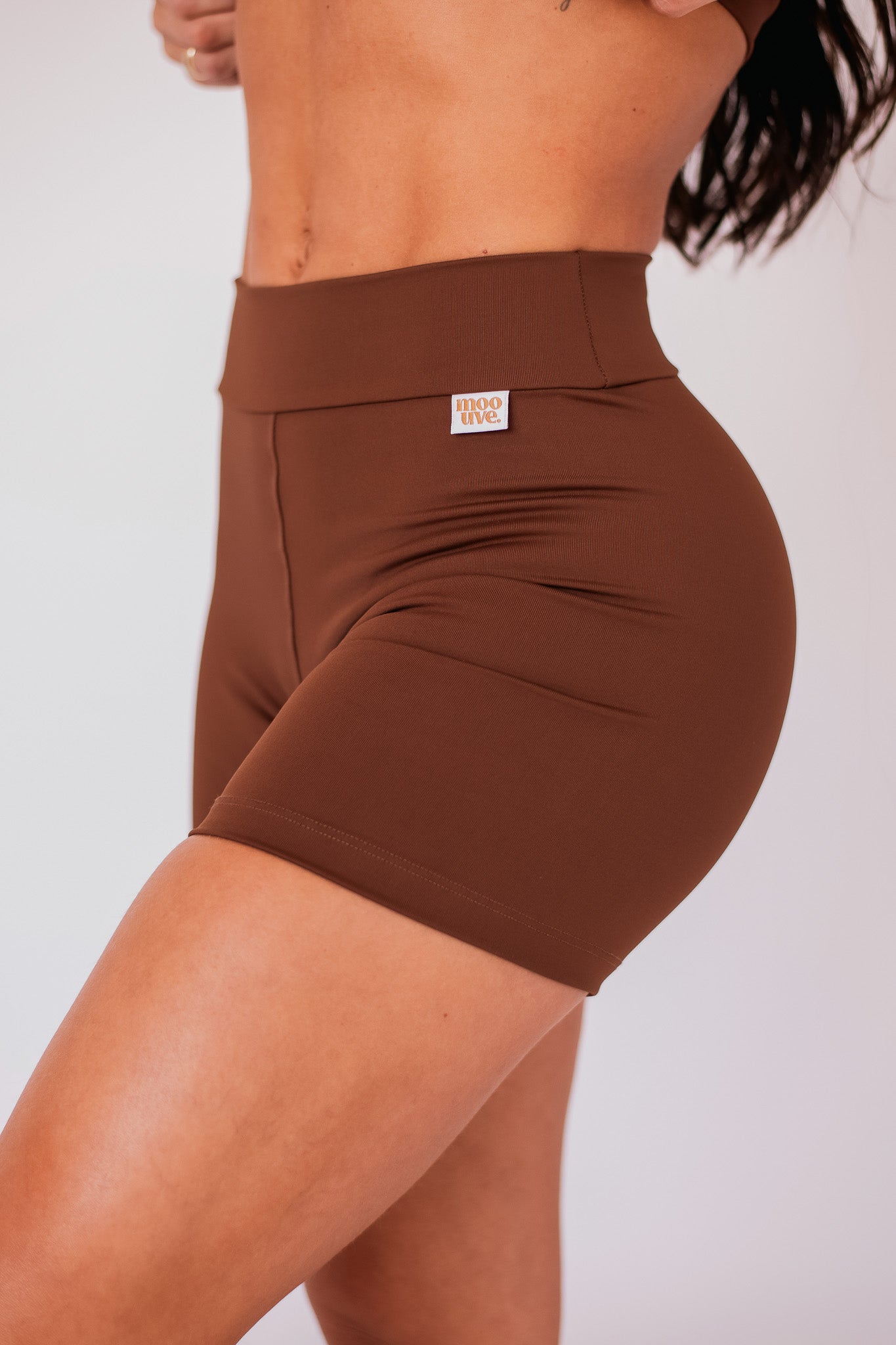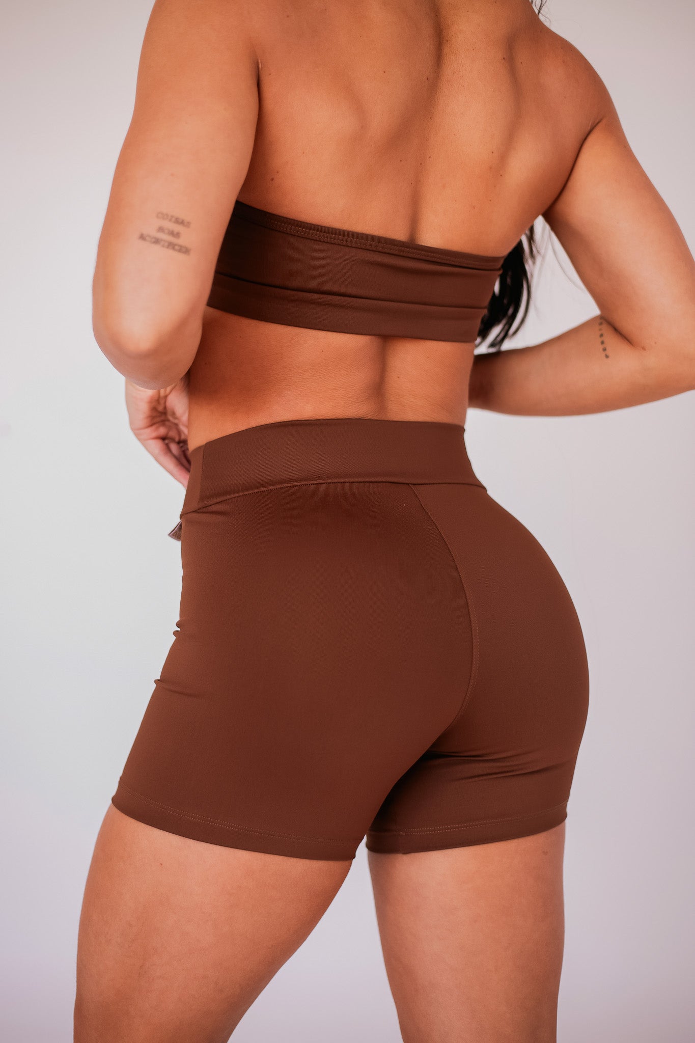 O short basic coffee é essa segunda opção: firme, sóbrio, elegante. Um lembrete sutil de que intensidade não precisa ser barulho — basta presença. O tom café transmite profundidade, enquanto a modelagem minimalista abraça o corpo com naturalidade, valorizando suas formas sem exagero.